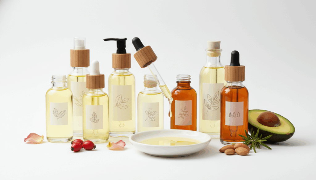 Typiske varianter inkluderer single-olie valg som rosenhip, argan, jojoba, marula og avocado, samt blandede olier der kombinerer disse for at målrette tør, moden eller følsom hud. For følsom hud vælger man duftfri og enkelt ingrediens; for kombineret eller tør hud kan en rigere eller lettere formel være passende.