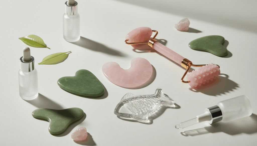 Gua Sha og Ansigtsmassage samler håndflade-værktøjer og krystalredskaber til ansigt, hals og krop. Kategorien rummer Jade- og Rosenkvarts-sten i former som Gua Sha-skiver (U-form, hjerte og fisk), samt 2-i-1 produkter som Faceroller Gua Sha Mix. Værktøjerne stimulerer blodcirkulation, lindrer spændinger og giver en naturlig glød. Brug dem med serum eller olie for bedre glide og optagelse af aktive ingredienser. Valget kan afhænge af materiale, størrelse og form, samt håndværk og nem rengøring. Find dem hos Helsebixen.dk og Helsam.
