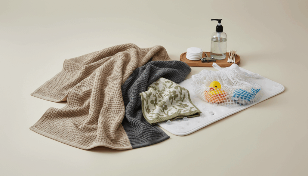 Håndklæder og Badetilbehør dækker alt til tørhed, pleje og komfort i badeværelset og omkring hjemmet. I denne kategori finder du håndklæder og badehåndklæder i flere størrelser og materialer – typisk 100 % bomuld eller økologisk bomuld – ofte med vaffel- eller strikket mønster der øger absorptionskapaciteten og giver et luksuriøst touch. Bademåtter og brusebadsmåtter med skridsikker underside og sugekopper giver stabilitet og tryghed under brug. Tilbehør som neglepleje, vatpinde og net til badeleg giver praktiske løsninger til pleje og leg. Når du vælger, kig efter vægt, tørreevne, vaskeanvisninger, farver og holdbarhed, så de passer til dit hjem og din familie. Ren-velvaereshop.dk og Hedenhus.dk er eksempler på leverandører af kvalitetstekstiler.