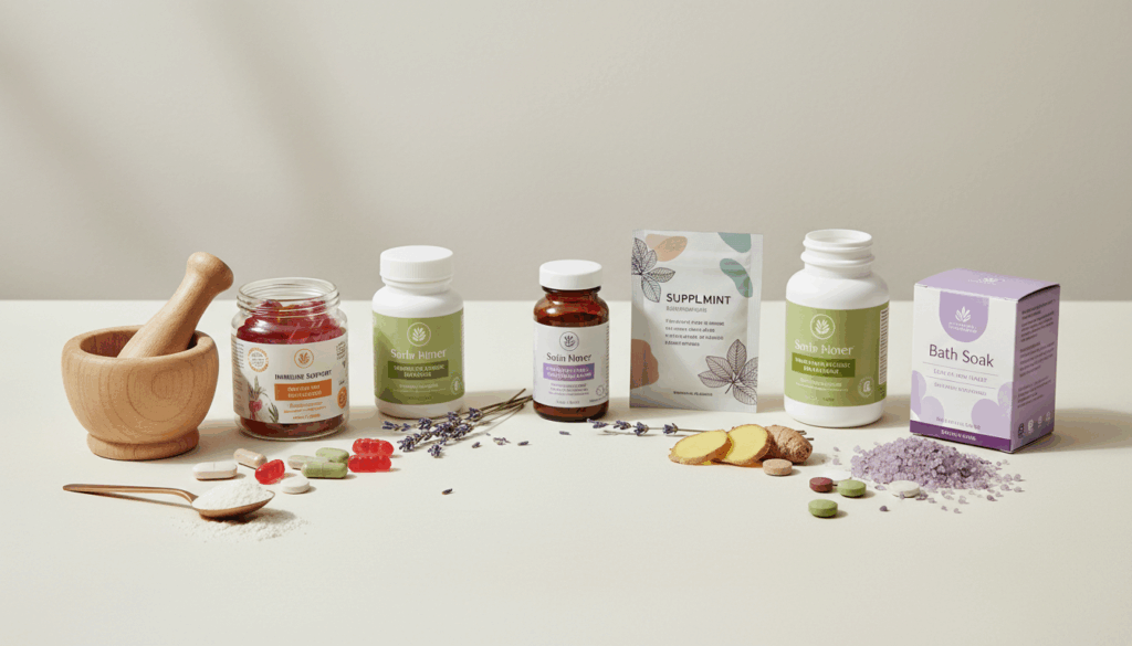 Typiske eksempler er immunstøtte med urter og mineraler, søvn- og afslapningstilskud, samt hud/hår/negle-støtte som kollagen eller biotin. Variationerne giver fleksibilitet til at støtte krop og velvære i hverdagen.