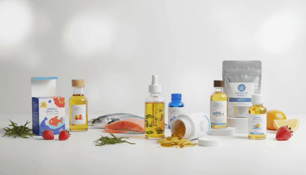 Produkter i denne kategori varierer i kilde og koncentration. Fiskebaserede olier giver ofte høj EPA/DHA, mens algeolie giver et fuldt vegansk alternativ. Krillolie og torskeleverolie kan også indeholde ekstra næringsstoffer som vitamin D og E. Mange varianter fås med frugtsmag og forskellige doseringsformer.