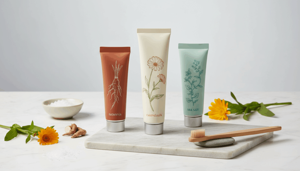 Disse produkter lægger vægt på blid pleje af tænder og tandkød gennem planteekstrakter og uden syntetiske farver. Fluoridindhold, smag og anvendelsesområde varierer, så vælg en form, der passer til dine behov: følsomme tænder, børn eller allergier. Salt-tandpasta giver frisk fornemmelse; calendula- og ratanhia-versionerne er særligt skånsomme ved følsomme munddele.